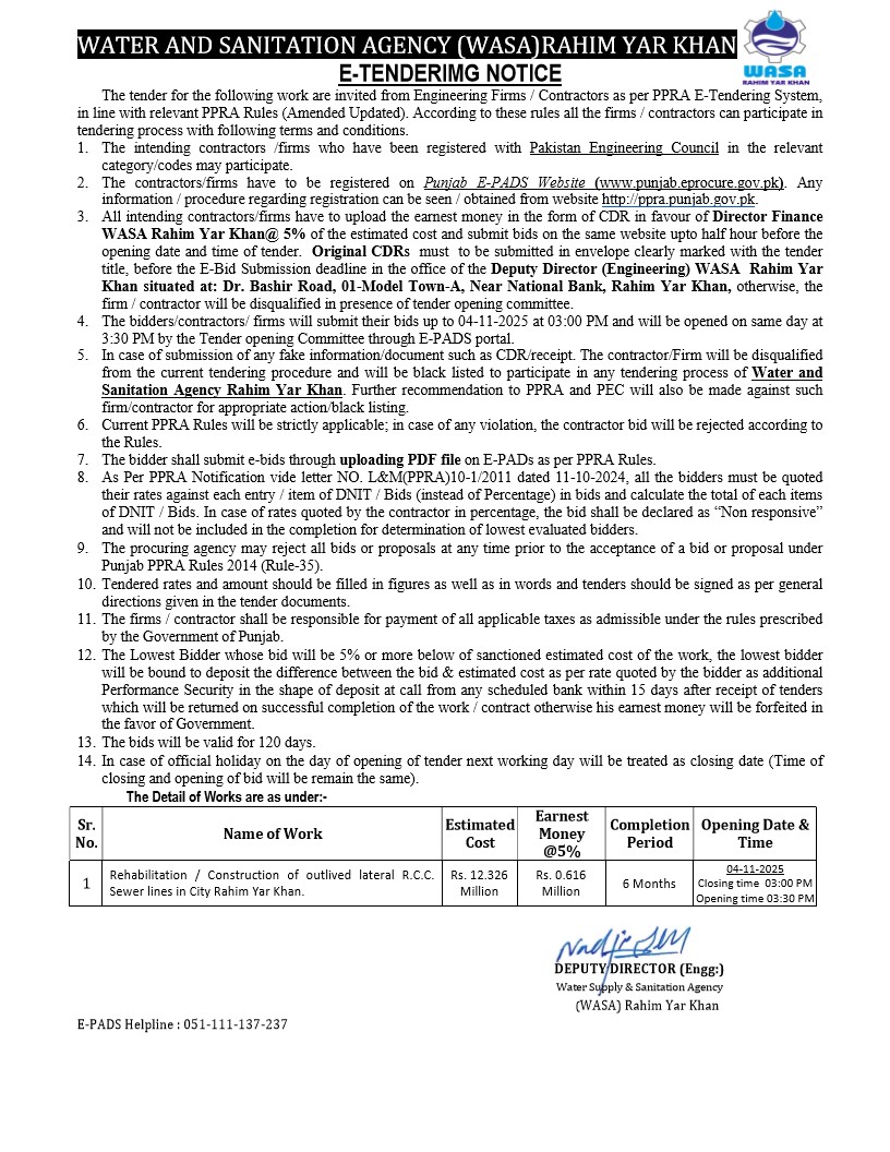 Water Supply Scheme / Drains / Sewerage, WASA, Roads, Repair & Maintenance, Engineering, Construction, Buildings