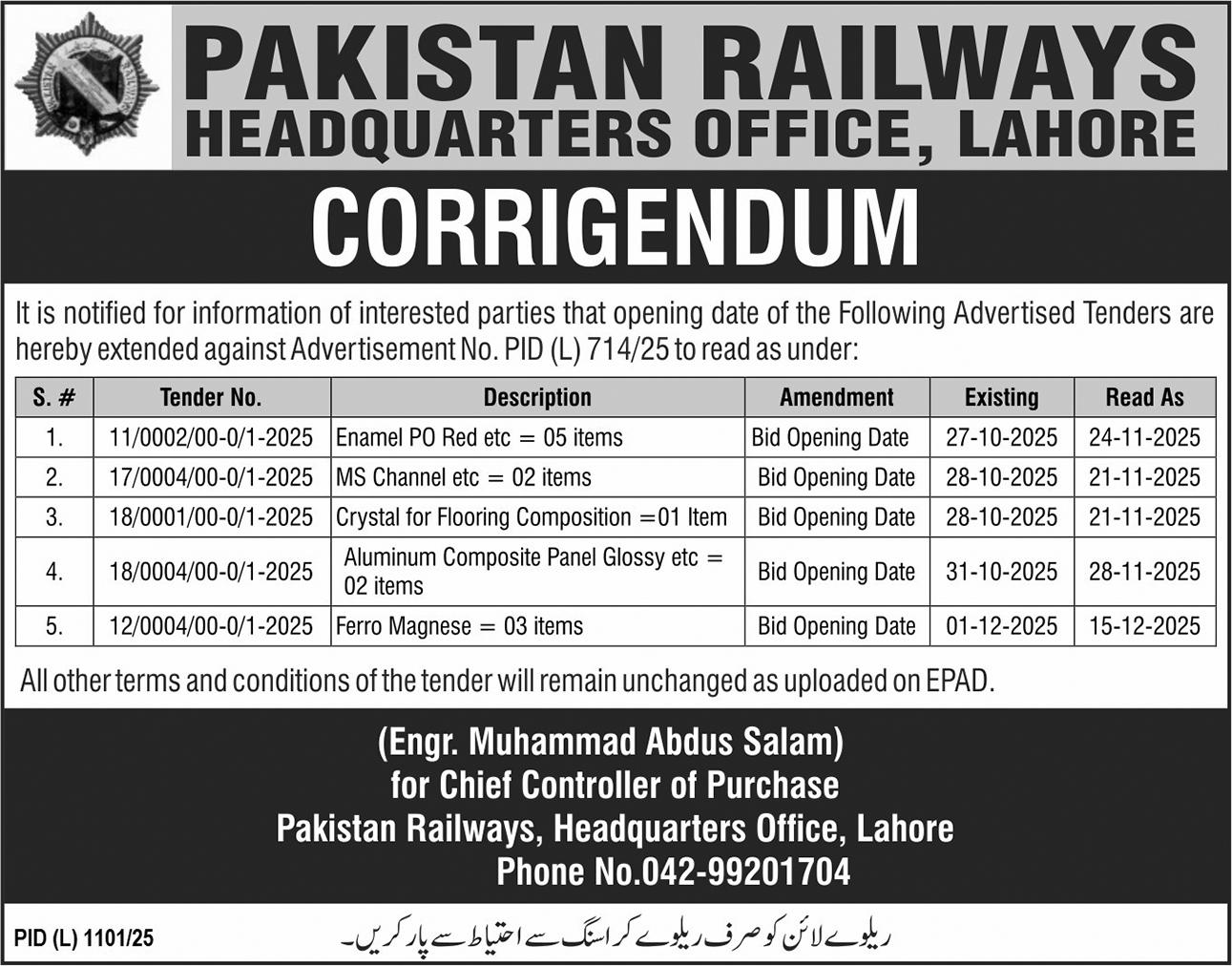 Steel, Railway, Mechanical, Machinery, General Order Supply, Electronics, Electrical, Corrigendum/Addendum