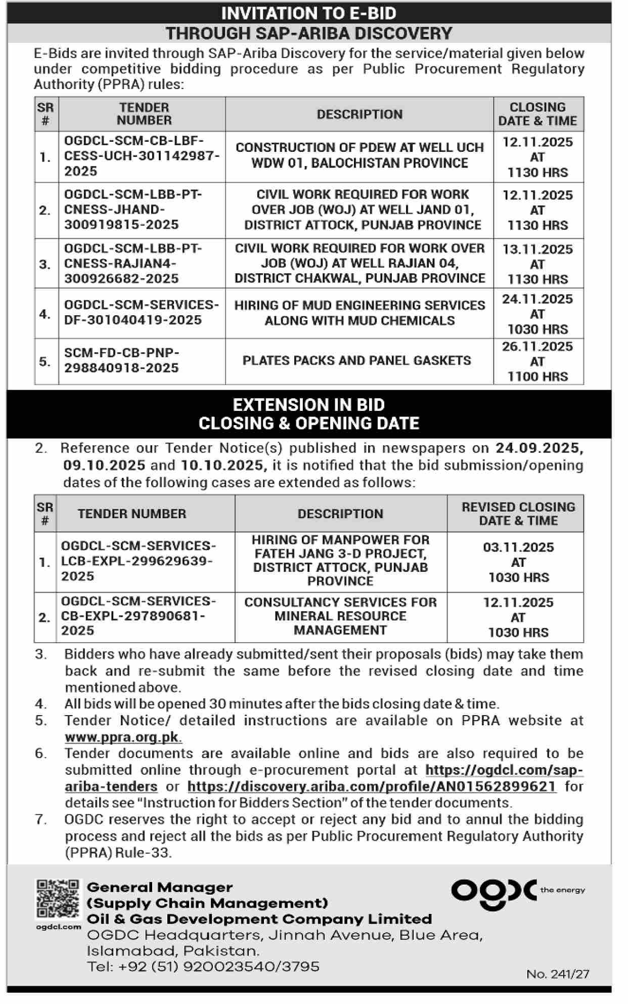 Services Required, Roads, Repair & Maintenance, OGDCL, OGDCL, Mechanical, Machinery, Labor Required, General Order Supply, Engineering, Electronics, Electrical, Consultancy, Construction, CNG Kits, Buildings