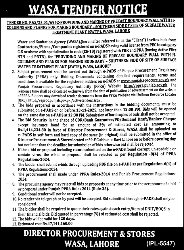 Water Supply Scheme / Drains / Sewerage, WASA, Roads, Repair & Maintenance, LDA, Engineering, Construction, Buildings
