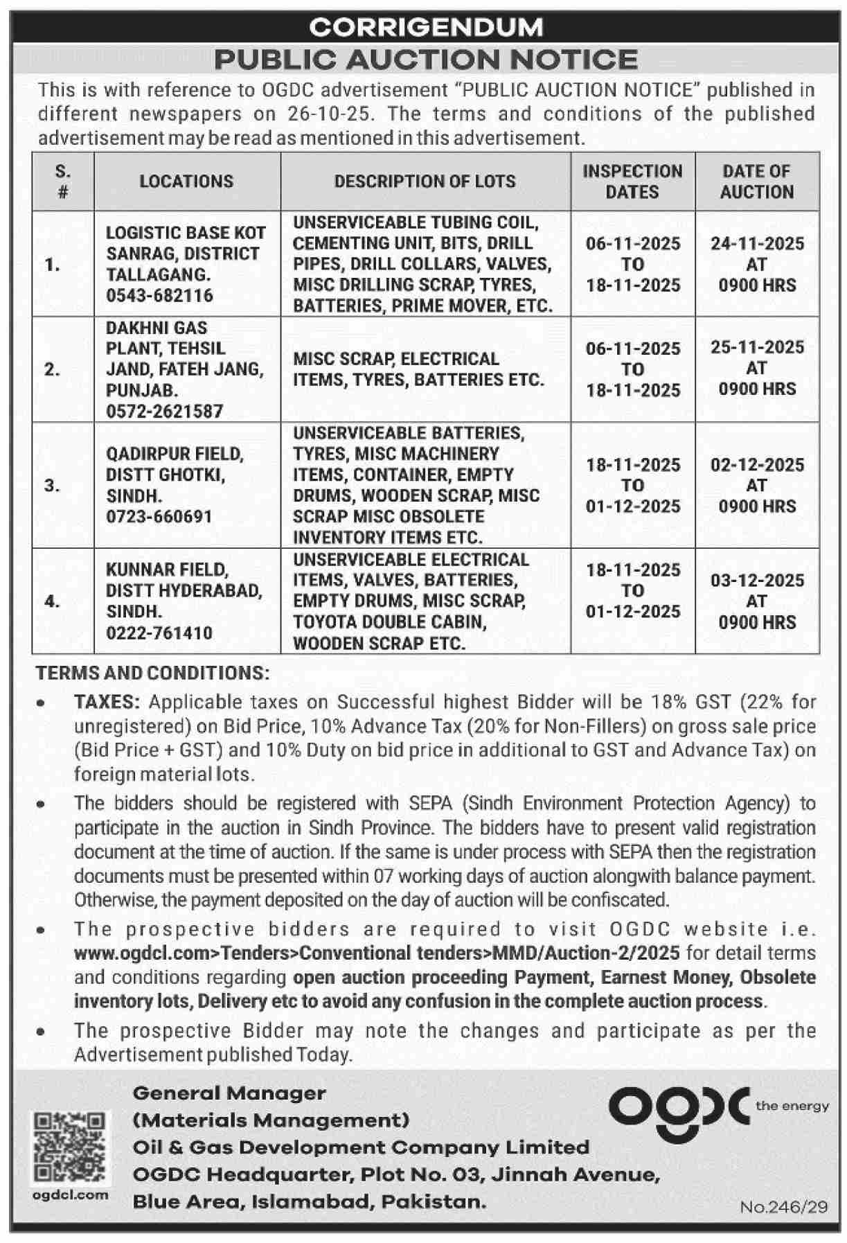 Toll Tax, Scrap Material, OGDCL, OGDCL, Corrigendum/Addendum , Baldia, Auction