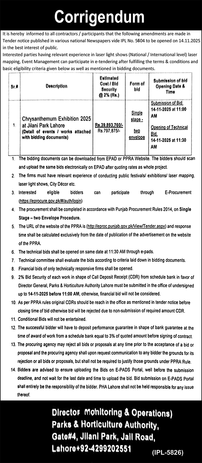 Horticulture, General Order Supply, Food / Soap etc., Corrigendum/Addendum