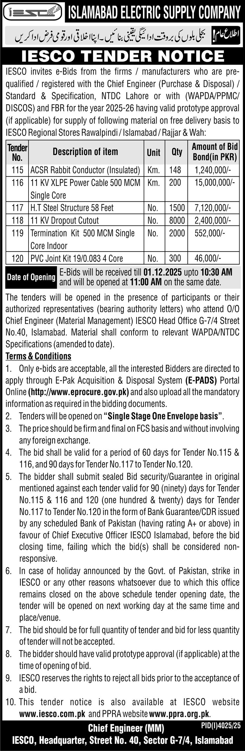 WAPDA, Steel, Pipes, Mechanical, Machinery, Generators, General Order Supply, Fiber, Energy, Electronics, Electrical, Cables