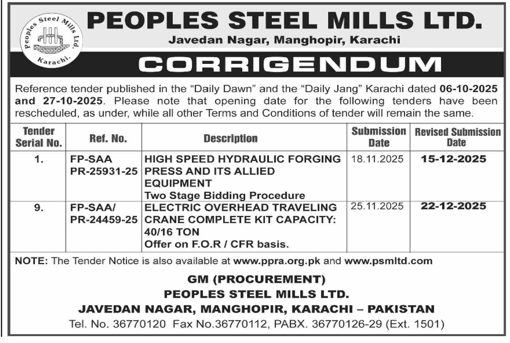 Steel, Mechanical, Machinery, Hydraulic Machinery, General Order Supply, Electronics, Electrical, Earth Moving Machinery, Corrigendum/Addendum