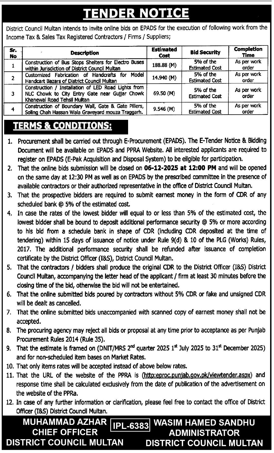 Roads, Repair & Maintenance, Mechanical, Machinery, Light, General Order Supply, Fabrication, Engineering, Electronics, Electrical, Construction, Buildings, Baldia