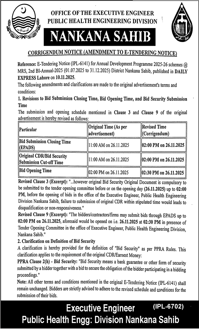 Water Supply Scheme / Drains / Sewerage, Water, Roads, Repair & Maintenance, Filter, Engineering, Corrigendum/Addendum , Construction, Buildings