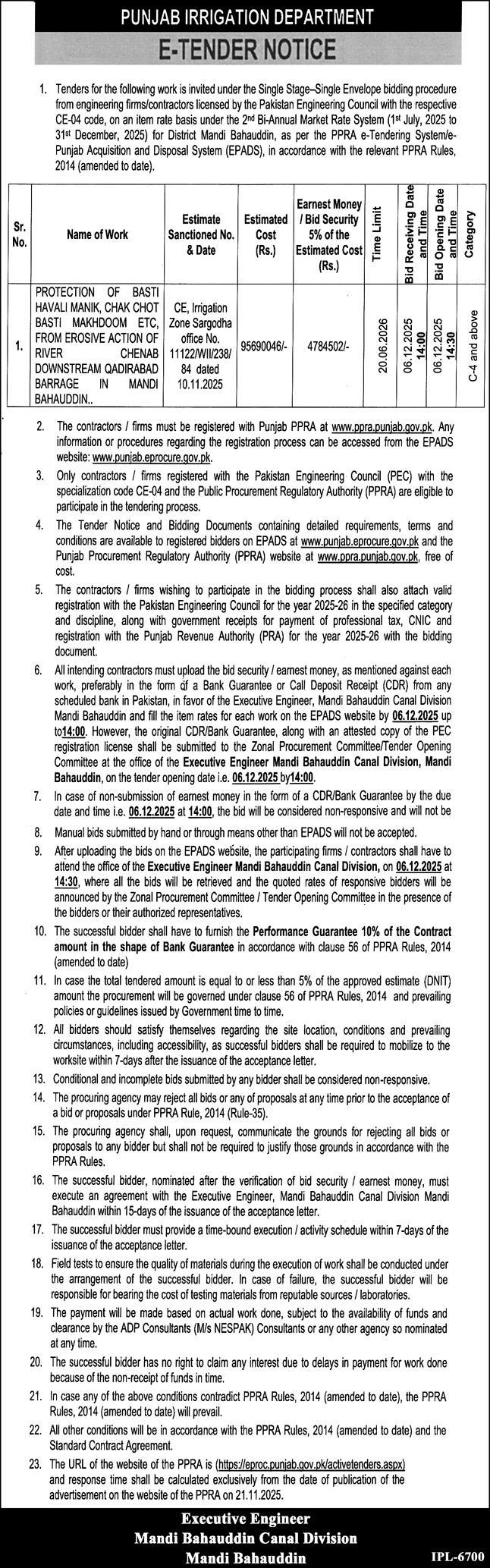 Executive Engineer, Drainage Division, Mandi Bahauddin