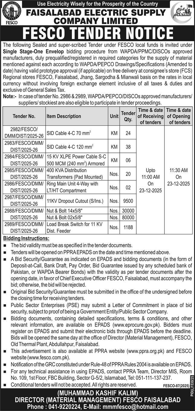 WAPDA, Mechanical, Machinery, General Order Supply, Energy, Electronics, Electrical, Cables