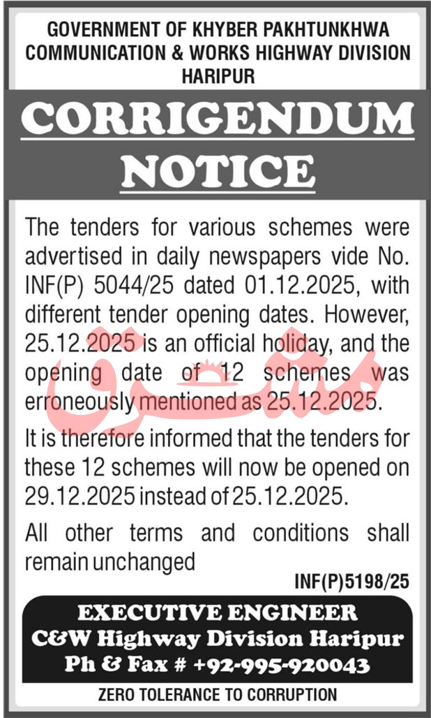 Water Supply Scheme / Drains / Sewerage, Roads, Repair & Maintenance, Engineering, Corrigendum/Addendum , Construction, Buildings