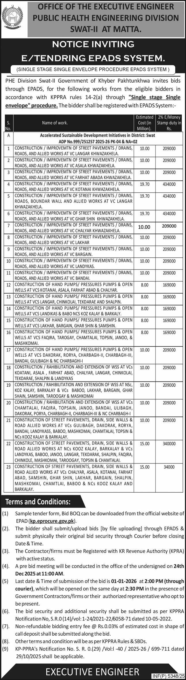 Water Supply Scheme / Drains / Sewerage, Roads, Repair & Maintenance, Engineering, Construction, Buildings