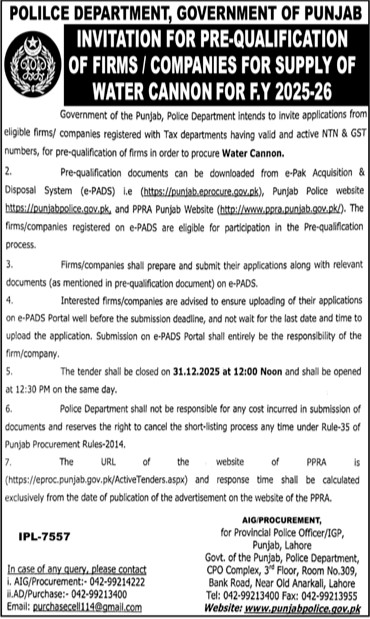 Water, Pre Qualification, Mechanical, Machinery, General Order Supply