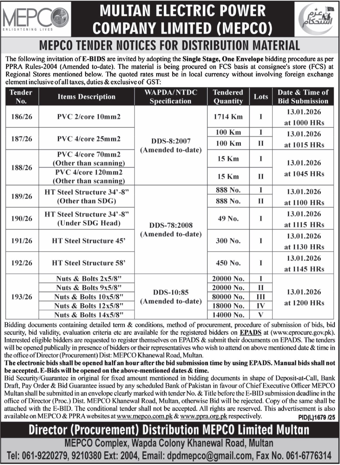WAPDA, Mechanical, Machinery, General Order Supply, Electronics, Electrical, Cables