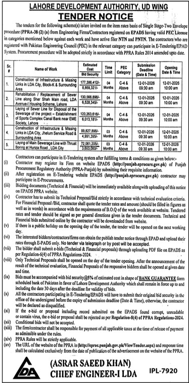 Water Supply Scheme / Drains / Sewerage, Roads, Repair & Maintenance, LDA, Engineering, Development Authority, Construction, Buildings