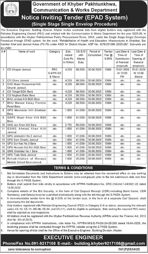 Water Supply Scheme / Drains / Sewerage, Roads, Repair & Maintenance, Engineering, Construction, Communication & Works, Buildings