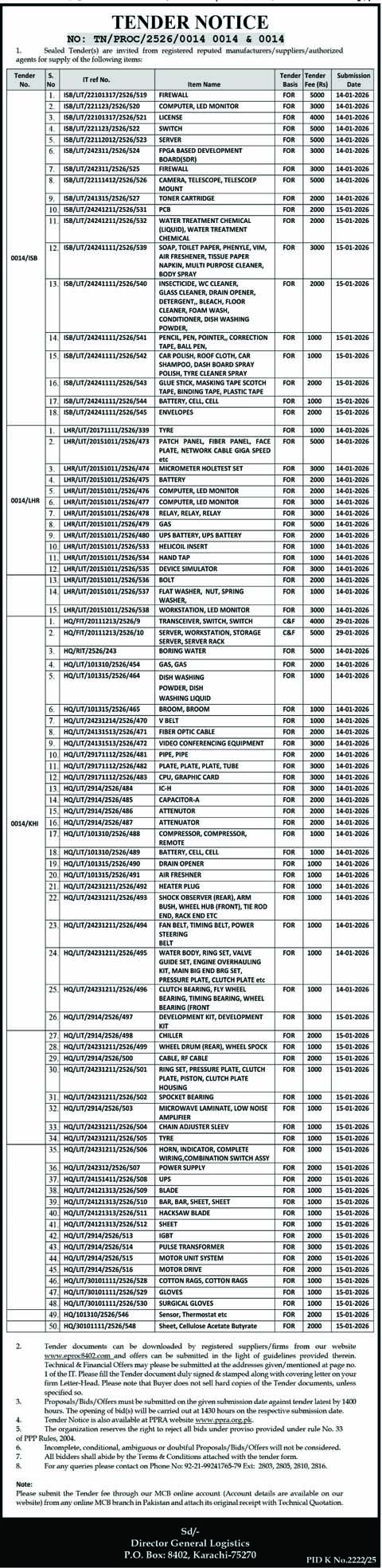 Water, UPS, Transportation, Textile/Uniform/Shoes, Stationery, Software, P.O. Box, Networking, Mechanical, Machinery, IT, General Order Supply, Food / Soap etc., Filter, Fiber, Energy, Electronics, Electrical, Computers/Accessories, Chemicals, Cables, Automobiles/Vehicles, Auto Parts, Air Conditioning