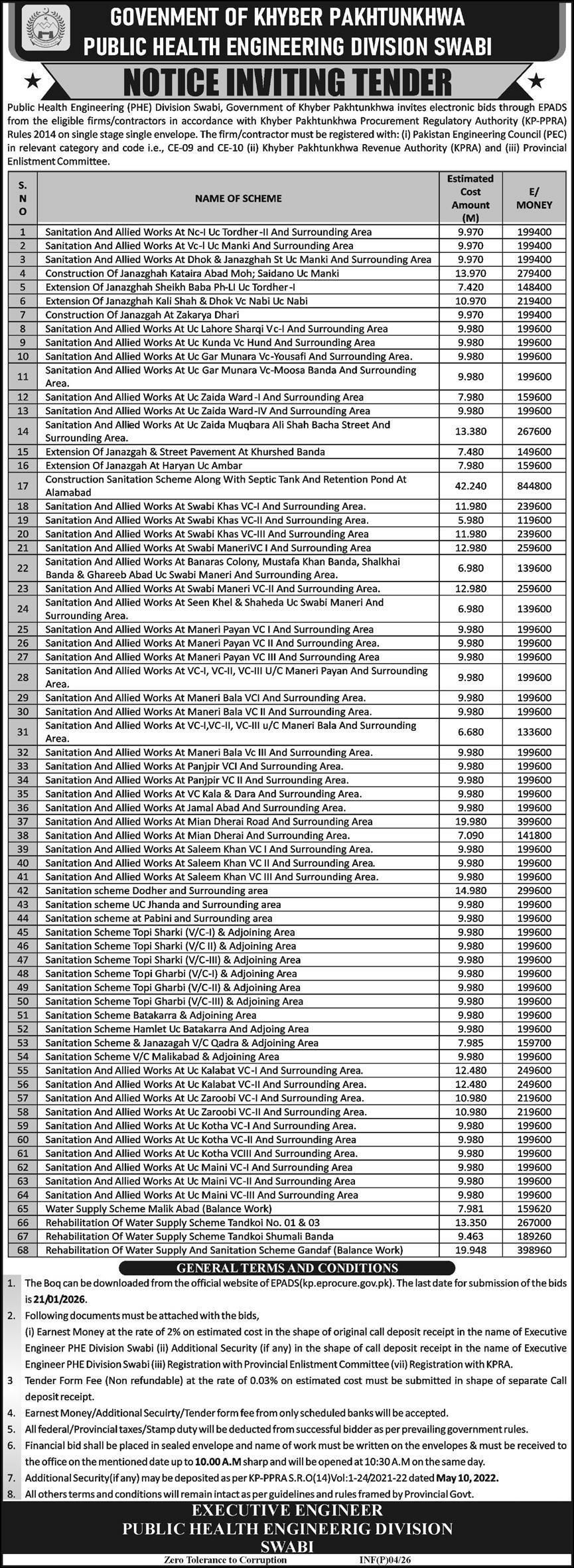 Water Supply Scheme / Drains / Sewerage, Roads, Repair & Maintenance, Engineering, Construction, Buildings