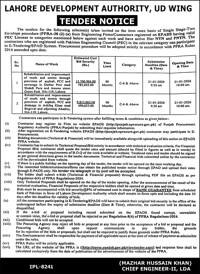 Water Supply Scheme / Drains / Sewerage, Roads, Repair & Maintenance, LDA, Engineering, Development Authority, Construction, Buildings