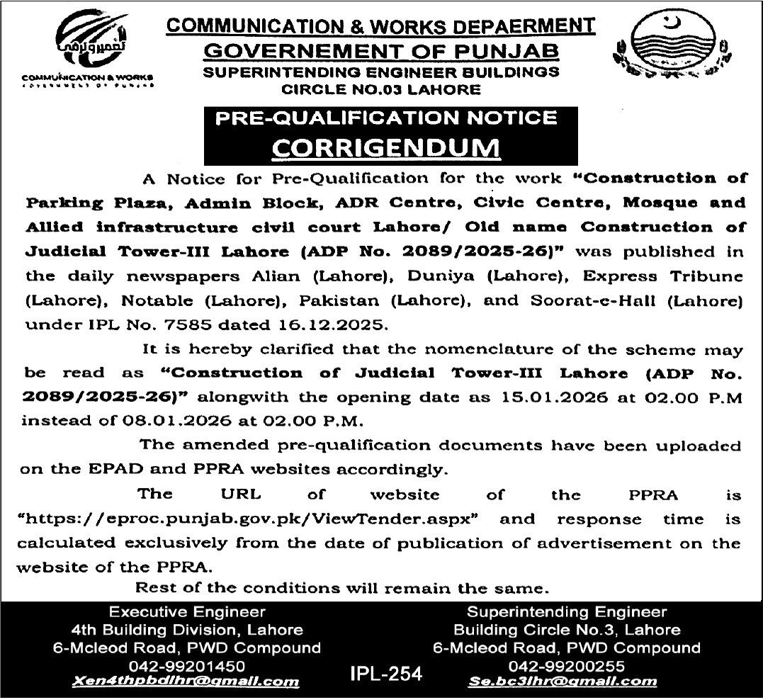 Water Supply Scheme / Drains / Sewerage, Roads, Repair & Maintenance, Pre Qualification, Engineering, Corrigendum/Addendum , Construction, Communication & Works, Buildings