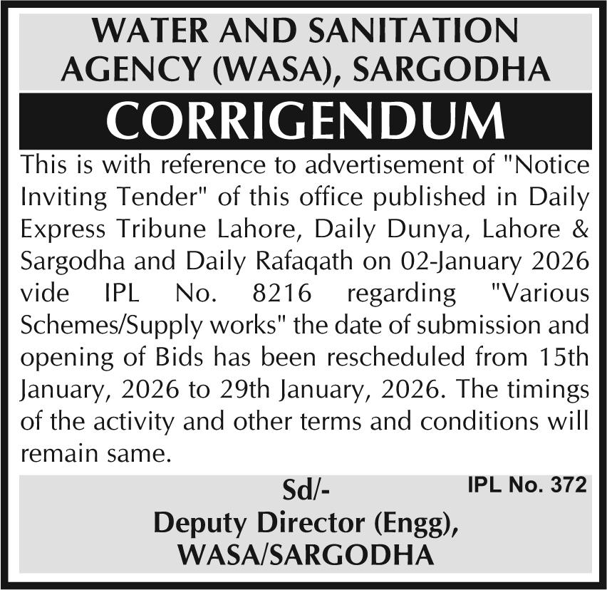 WASA, Transportation, Roads, Repair & Maintenance, General Order Supply, Engineering, Corrigendum/Addendum , Construction, Buildings, Automobiles/Vehicles, Auto Parts