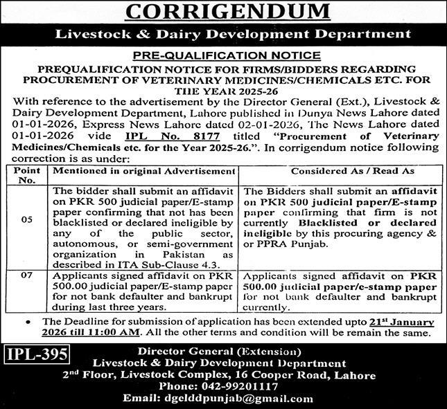 Veterinary, Pre Qualification, Photo Material, Pharma, Medical & Scientific, General Order Supply, Corrigendum/Addendum , Chemicals
