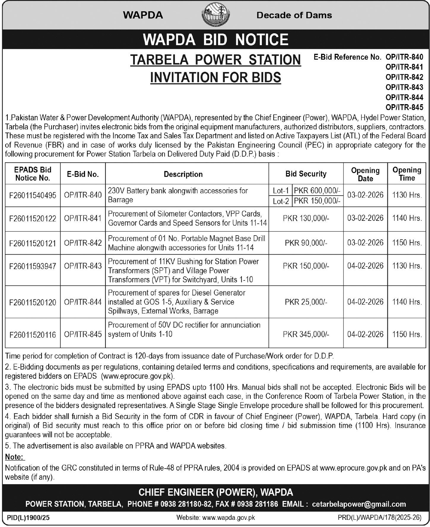 WAPDA, Mechanical, Machinery, General Order Supply, Energy, Electronics, Electrical
