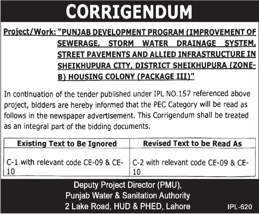 Water Supply Scheme / Drains / Sewerage, Roads, Repair & Maintenance, Engineering, Corrigendum/Addendum , Construction, Buildings