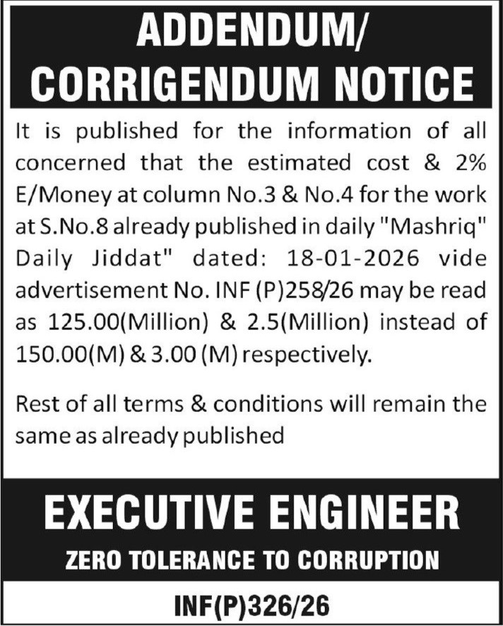 Buildings, Construction, Corrigendum/Addendum , Engineering, Repair & Maintenance, Roads, Water Supply Scheme / Drains / Sewerage
