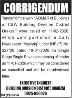 Buildings, Construction, Corrigendum/Addendum , Engineering, Repair & Maintenance, Roads, Water Supply Scheme / Drains / Sewerage