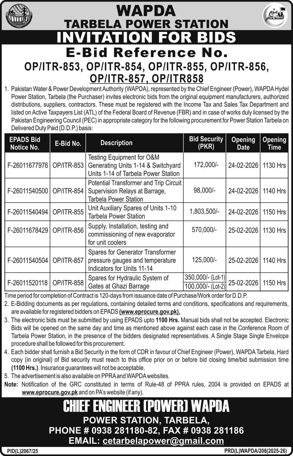Electrical, Electronics, Energy, General Order Supply, Generators, Hydraulic Machinery, Machinery, Mechanical, Steel, WAPDA