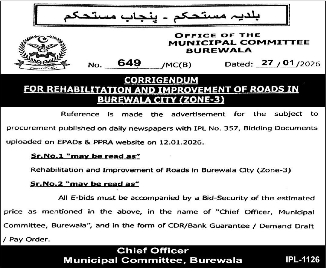 Buildings, Construction, Corrigendum/Addendum , Engineering, Repair & Maintenance, Roads, Water Supply Scheme / Drains / Sewerage
