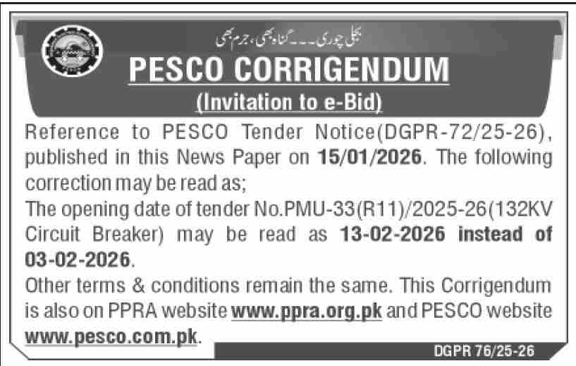 Corrigendum/Addendum , Electrical, Electronics, Energy, General Order Supply, Machinery, Mechanical, WAPDA