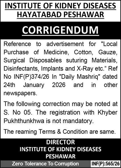 Corrigendum/Addendum , General Order Supply, Machinery, Mechanical, Medical & Scientific