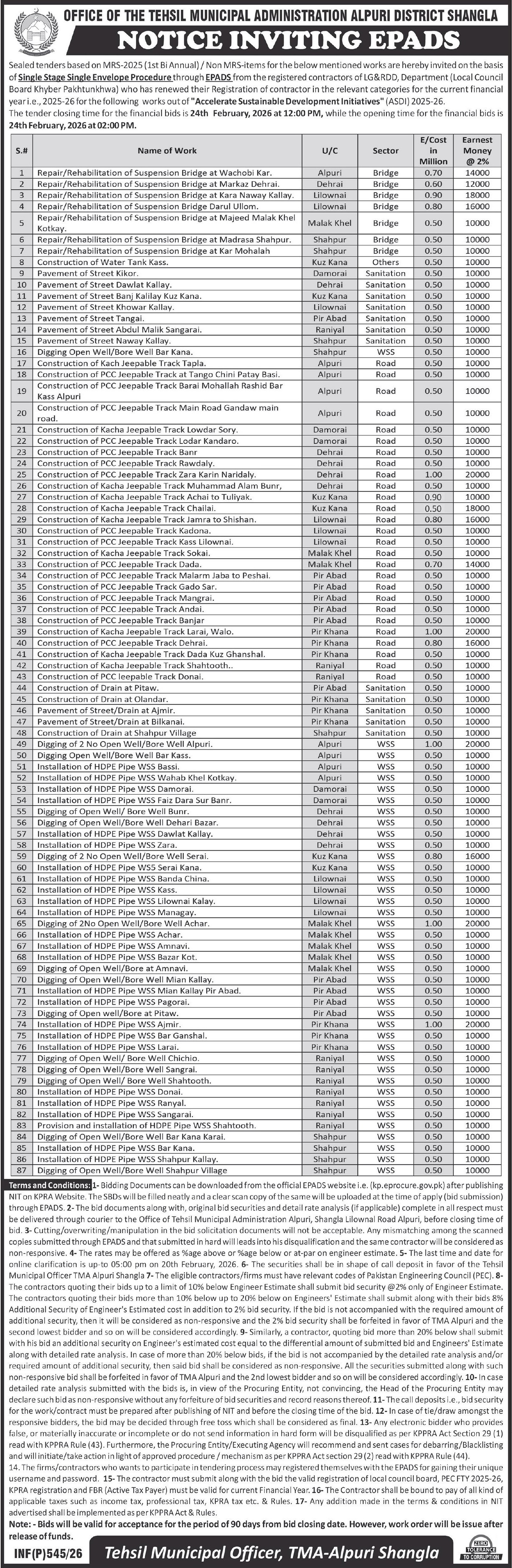 Buildings, Construction, Energy, Engineering, Pumps, Repair & Maintenance, Roads, Tubewells, Water Supply Scheme / Drains / Sewerage