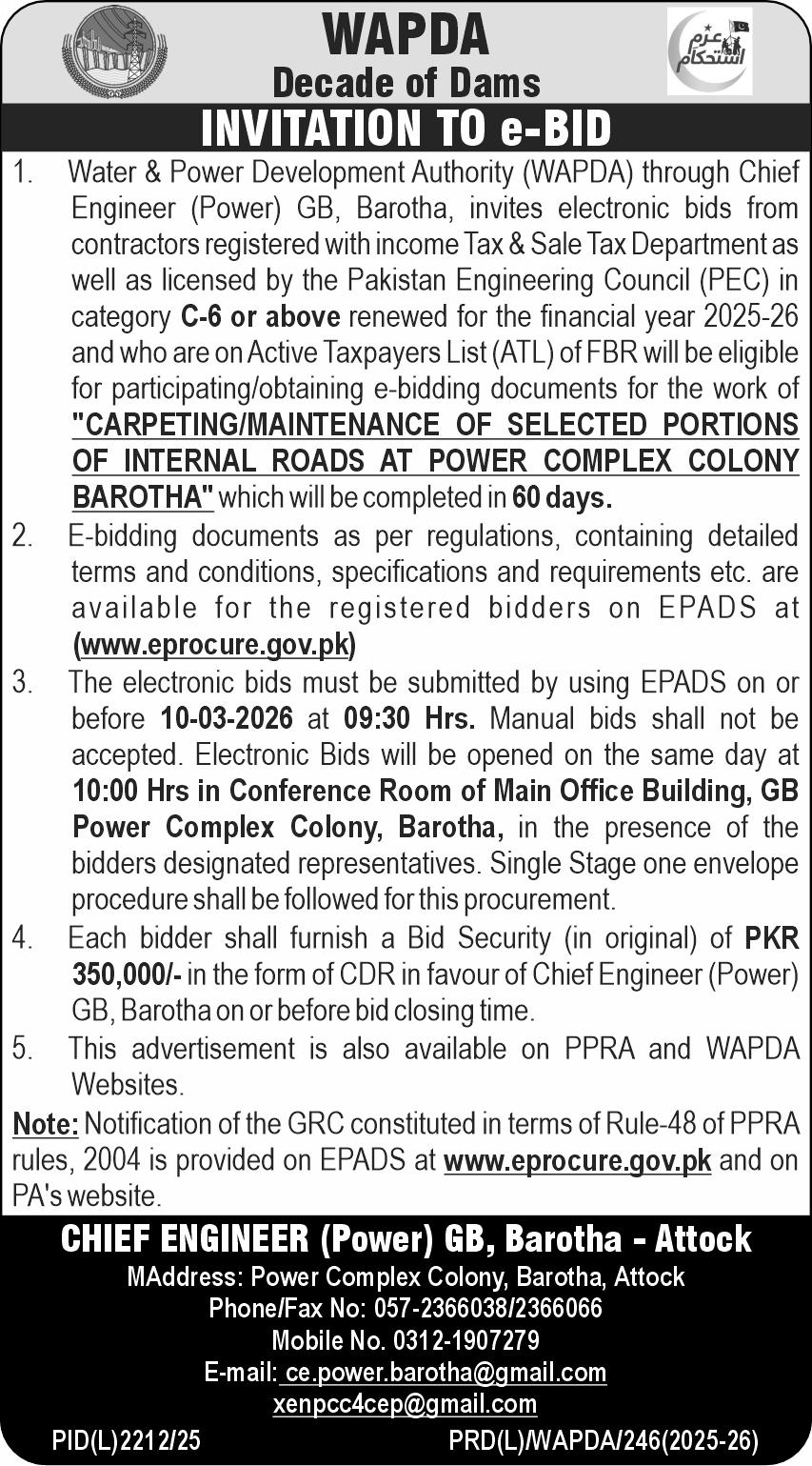 Buildings, Construction, Engineering, Repair & Maintenance, Roads, WAPDA, Water Supply Scheme / Drains / Sewerage