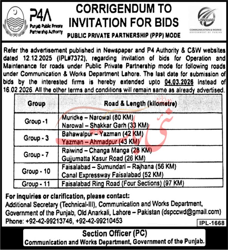 Buildings, Construction, Corrigendum/Addendum , Engineering, Repair & Maintenance, Roads, Water Supply Scheme / Drains / Sewerage