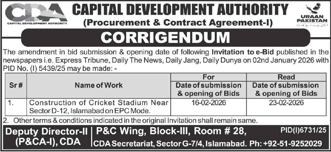 Buildings, Construction, Corrigendum/Addendum , Development Authority, Engineering, Repair & Maintenance, Roads