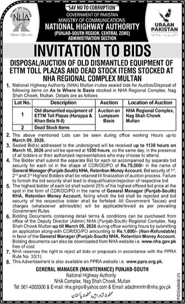 Auction, Baldia, Highways, NHA, Scrap Material, Toll Tax