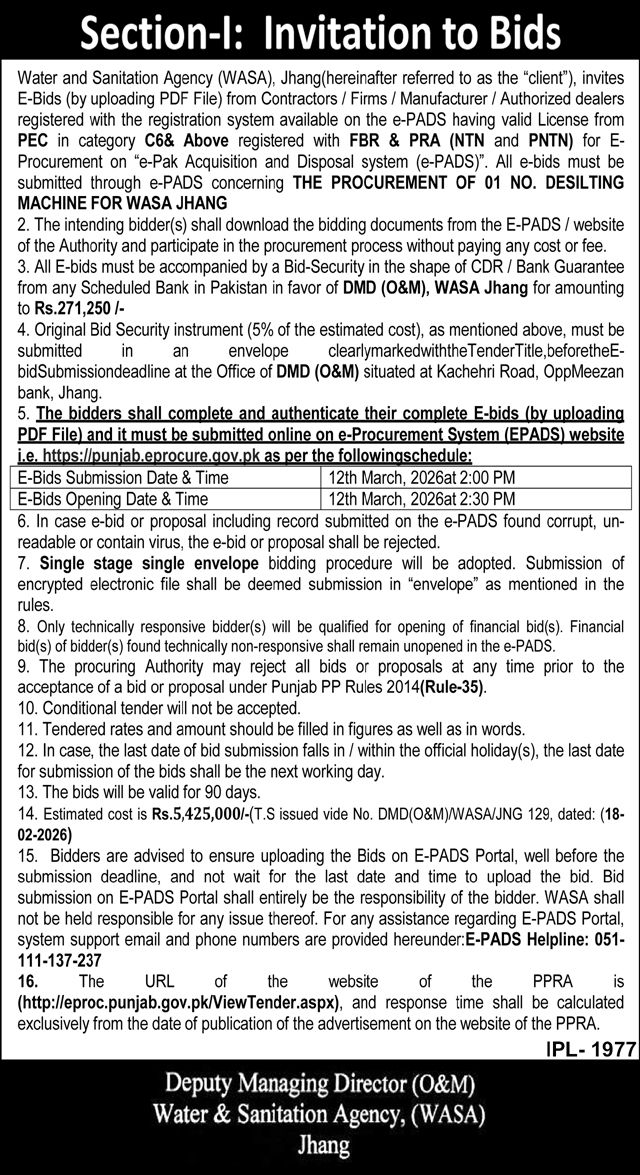 Construction, Engineering, General Order Supply, Machinery, Mechanical, Repair & Maintenance, Roads, WASA