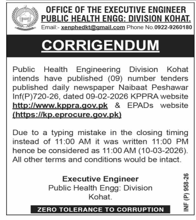 Buildings, Construction, Corrigendum/Addendum , Engineering, Repair & Maintenance, Roads, Water Supply Scheme / Drains / Sewerage
