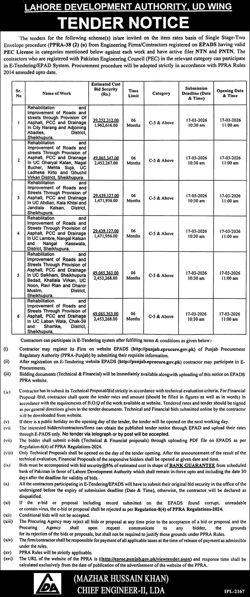 Buildings, Construction, Development Authority, Engineering, LDA, Repair & Maintenance, Roads, Water Supply Scheme / Drains / Sewerage