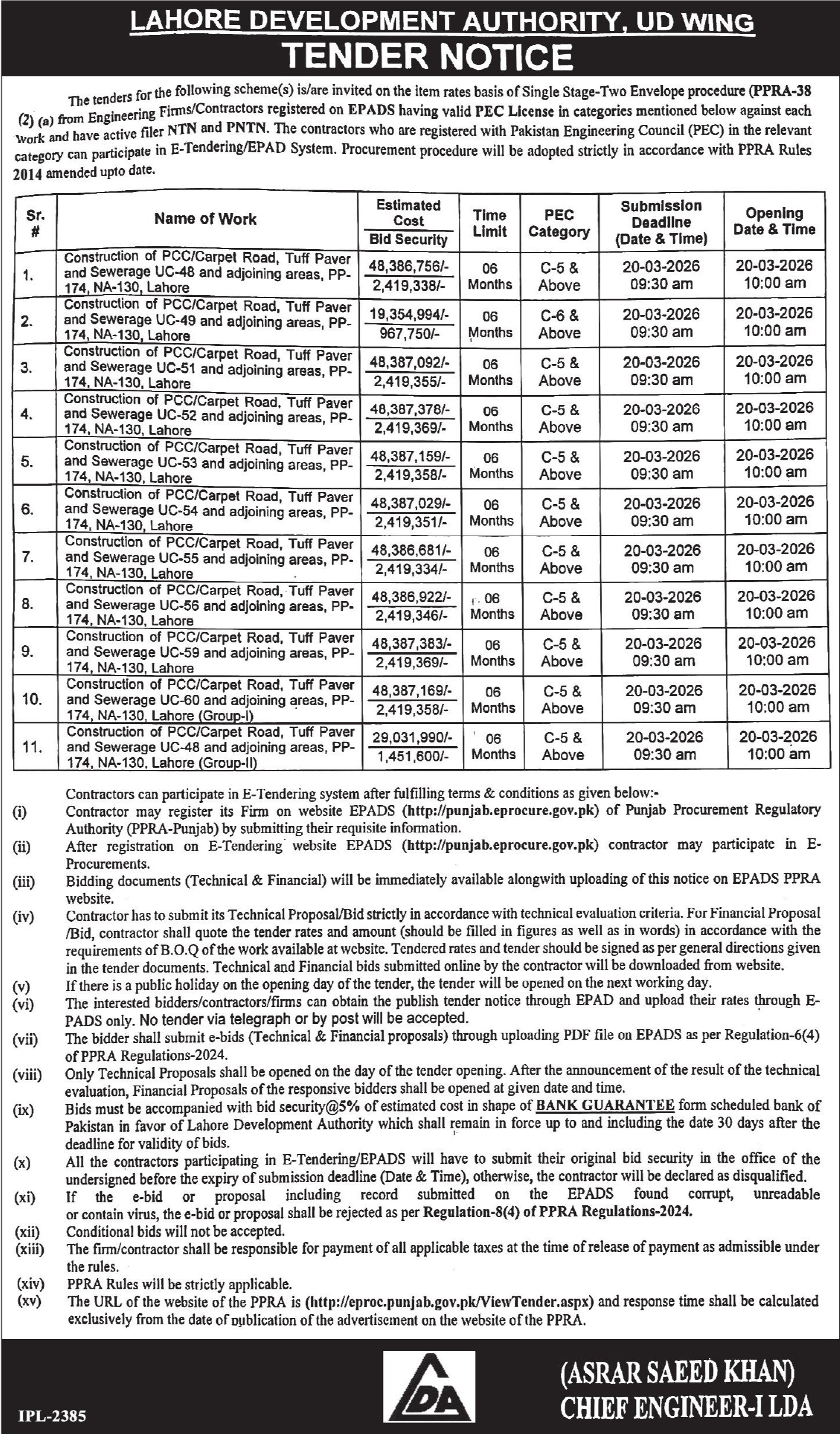 Buildings, Construction, Development Authority, Engineering, LDA, Repair & Maintenance, Roads, Water Supply Scheme / Drains / Sewerage