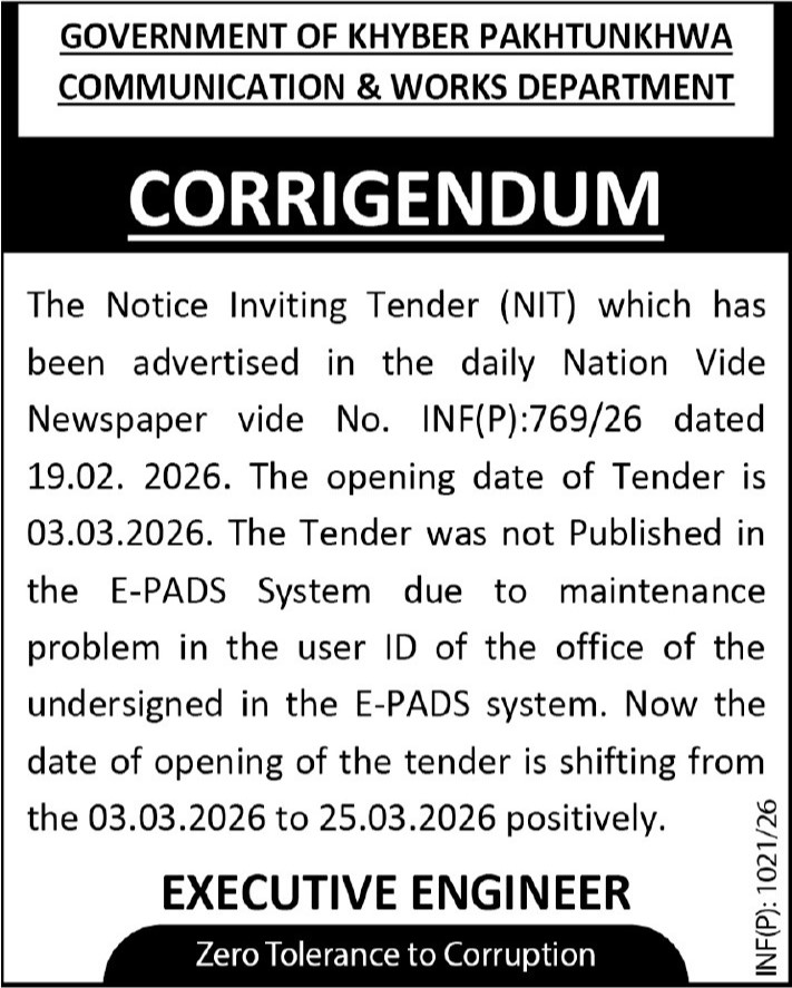 Buildings, Communication & Works, Construction, Corrigendum/Addendum , Engineering, Repair & Maintenance, Roads, Water Supply Scheme / Drains / Sewerage