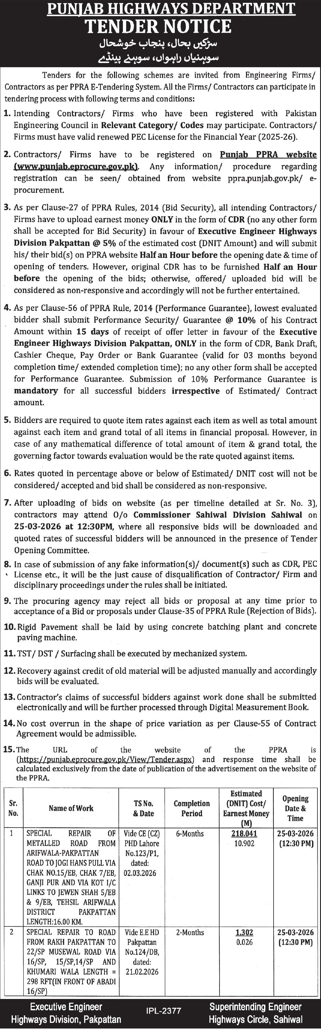 Buildings, Construction, Engineering, Highways, Repair & Maintenance, Roads, Water Supply Scheme / Drains / Sewerage