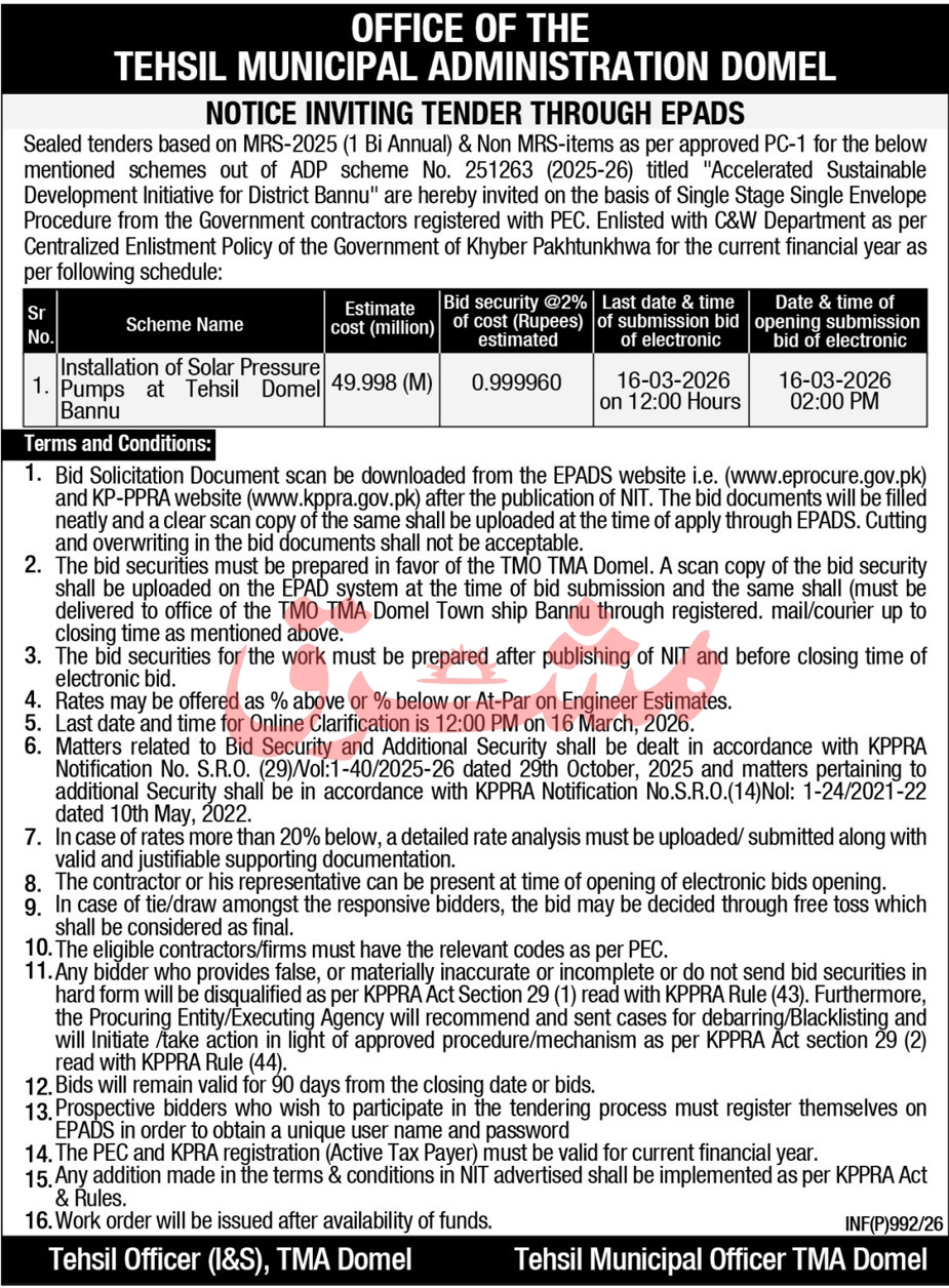Construction, Electrical, Electronics, Energy, Engineering, General Order Supply, Machinery, Mechanical, Pumps, Repair & Maintenance, Water Supply Scheme / Drains / Sewerage