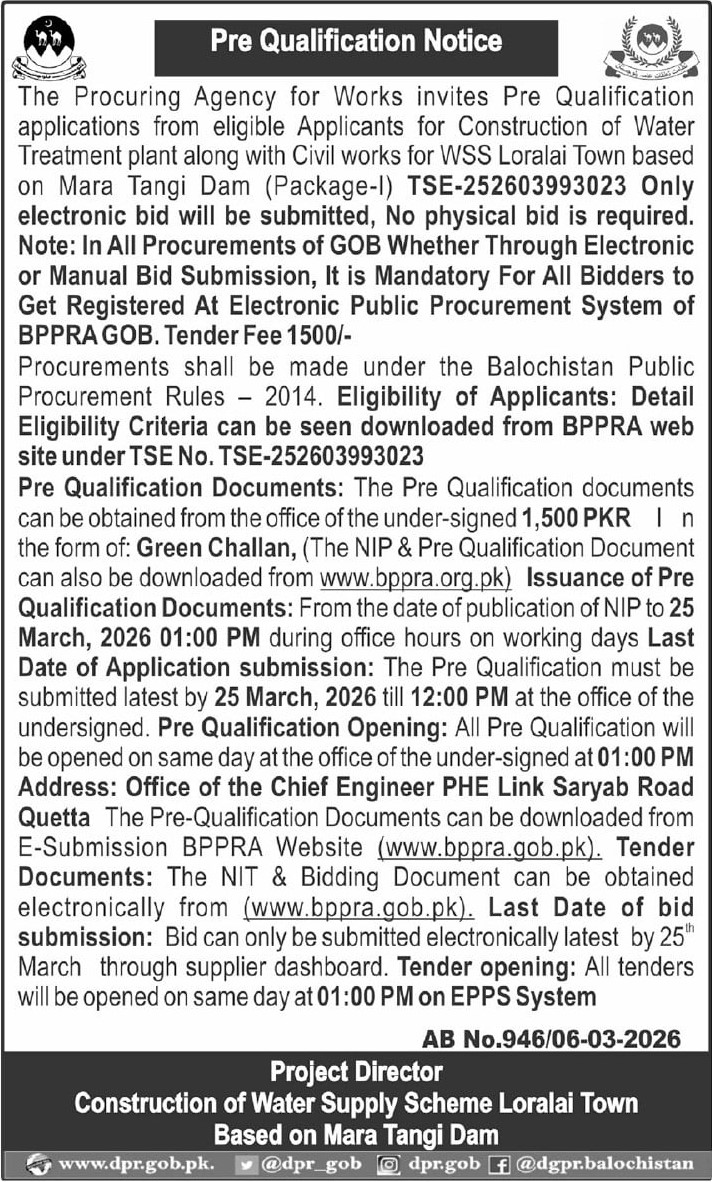 Buildings, Construction, Electrical, Electronics, Engineering, General Order Supply, Machinery, Mechanical, Pre Qualification, Repair & Maintenance, Roads, Water Supply Scheme / Drains / Sewerage