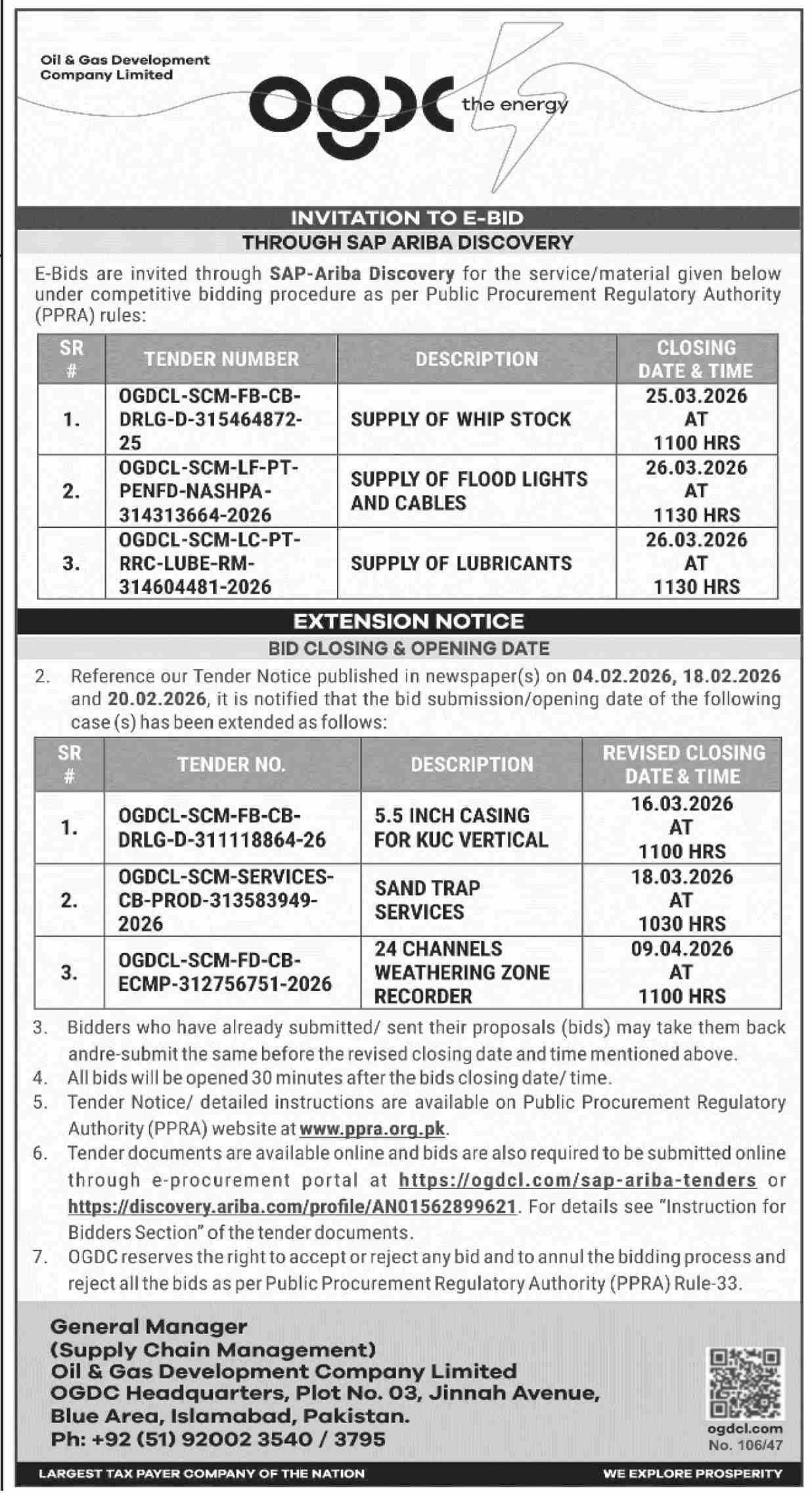 Cables, Electrical, Electronics, General Order Supply, Light, Machinery, Mechanical, OGDCL, OGDCL, Oil & Lubricant
