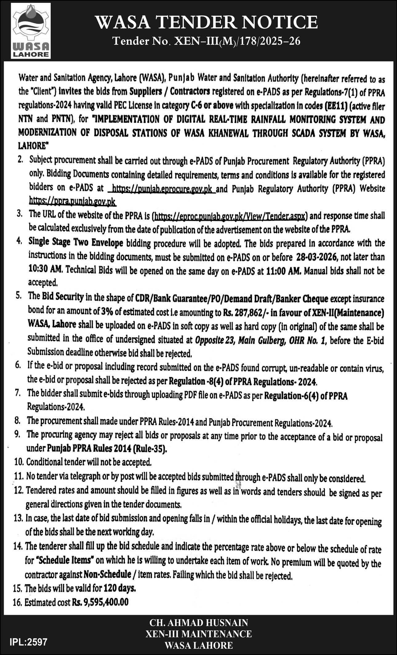 Construction, Engineering, General Order Supply, LDA, Machinery, Mechanical, Repair & Maintenance, WASA, Water Supply Scheme / Drains / Sewerage