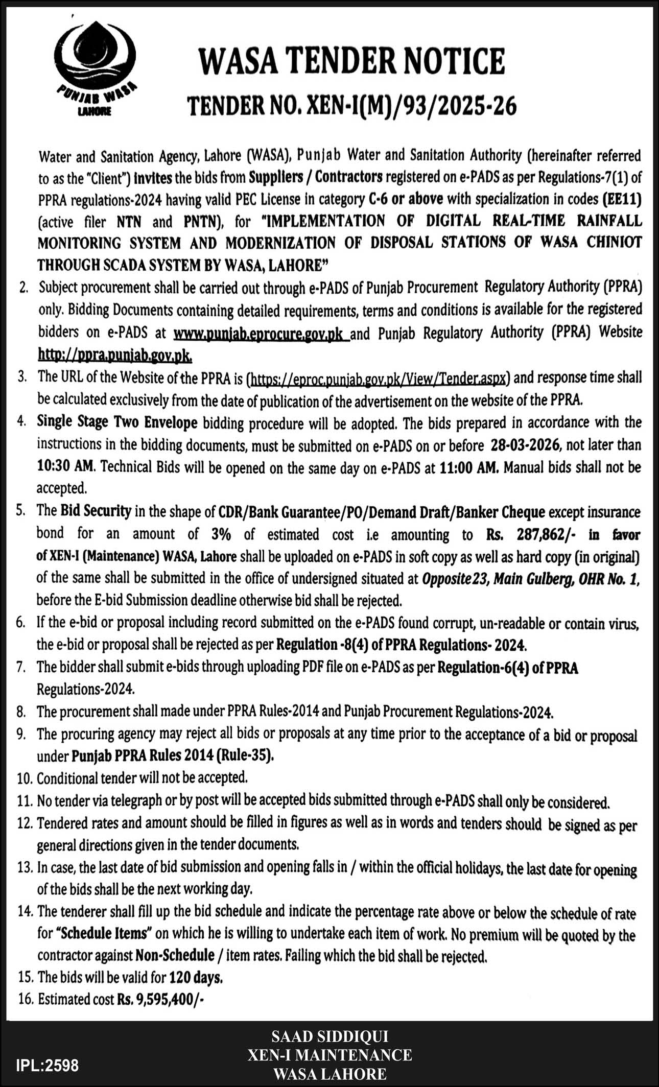 Construction, Engineering, General Order Supply, LDA, Machinery, Mechanical, Repair & Maintenance, WASA, Water Supply Scheme / Drains / Sewerage