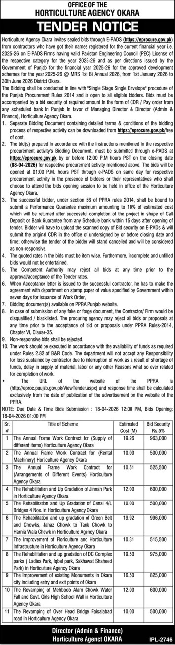 Bridges, Buildings, Construction, Electrical, Electronics, Engineering, General Order Supply, Horticulture, Machinery, Mechanical, Repair & Maintenance, Roads, Water Supply Scheme / Drains / Sewerage