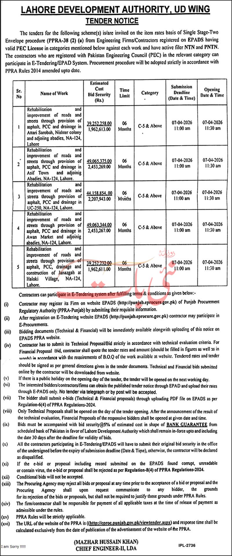 Buildings, Construction, Development Authority, Engineering, LDA, Repair & Maintenance, Roads, Water Supply Scheme / Drains / Sewerage